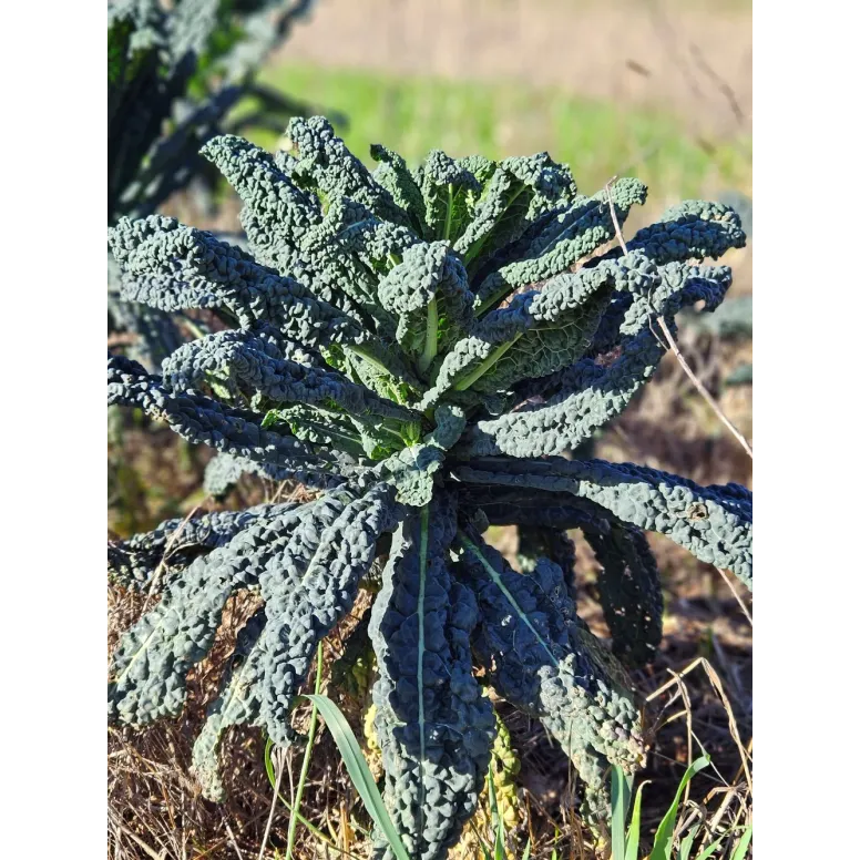 Chou frisé noir de Toscane, appelé aussi chou palmier, feuilles de grandes taille d'un vert foncé, gout excellent, se cuisine avec des oignons et tomates en bocaux pendant la saison froide.